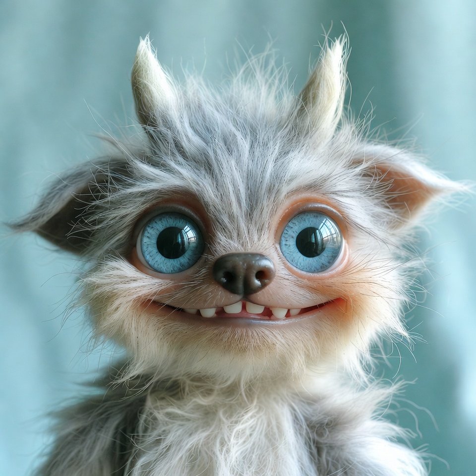 adorable, big eyes, black nose, blue eyes, cartoonish, demon, fantasy creature, furry animal, furry monster, googly eyes, gray fur, isolated background, plush toy, pointed ears, sharp teeth, small horns, smiling face, toy figure, whimsical, cute creature