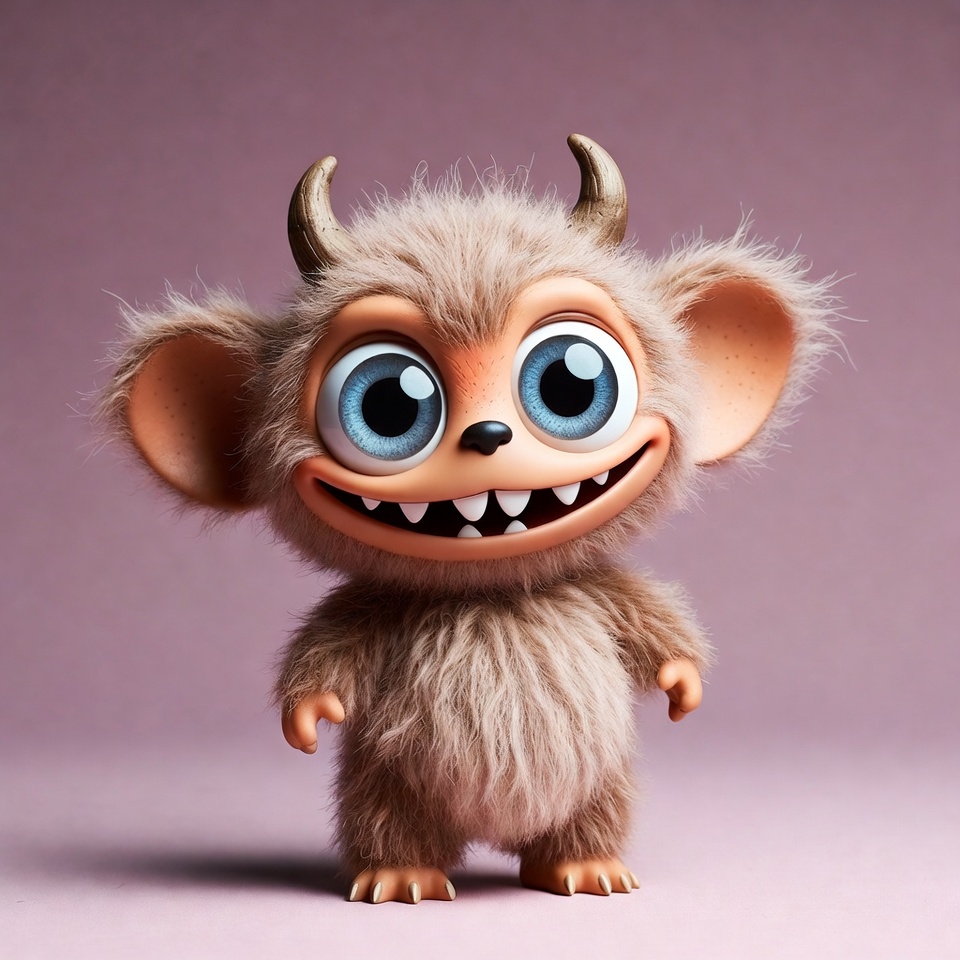 3D render, adorable, big eyes, blue eyes, brown fur, cartoonish, chibi, creature, demon, ears, fantasy, fluffy fur, furry, grinning, horns, illustration, isolated background, paws, pink background, playful, sharp teeth, cute monster