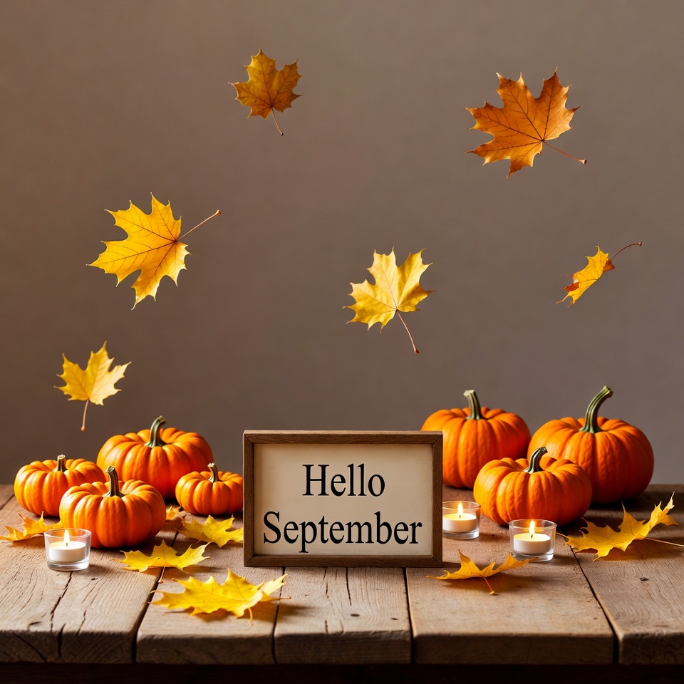 A wooden sign reading 'Hello September' stands in front of a cluster of orange pumpkins on a rustic wooden table. Bright yellow autumn leaves fall around the arrangement, with scattered leaves on the table and two lit candles nearby. The background is a soft gray with more floating leaves.