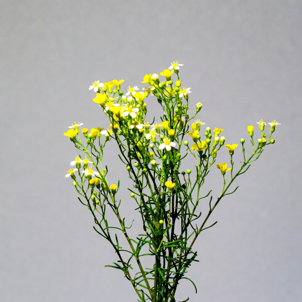 A close-up of a bunch of delicate yellow flowers with small white centers on thin green stems. The flowers are clustered together against a plain gray background. The arrangement appears fresh and isolated for display.