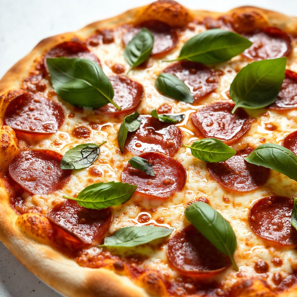 Italian food, basil leaves, cheese pizza, closeup, food, food photography, fresh basil, golden crust, gourmet pizza, green herbs, melted cheese, pepperoni, pepperoni pizza, sliced pepperoni, tomato sauce, white background, pizza