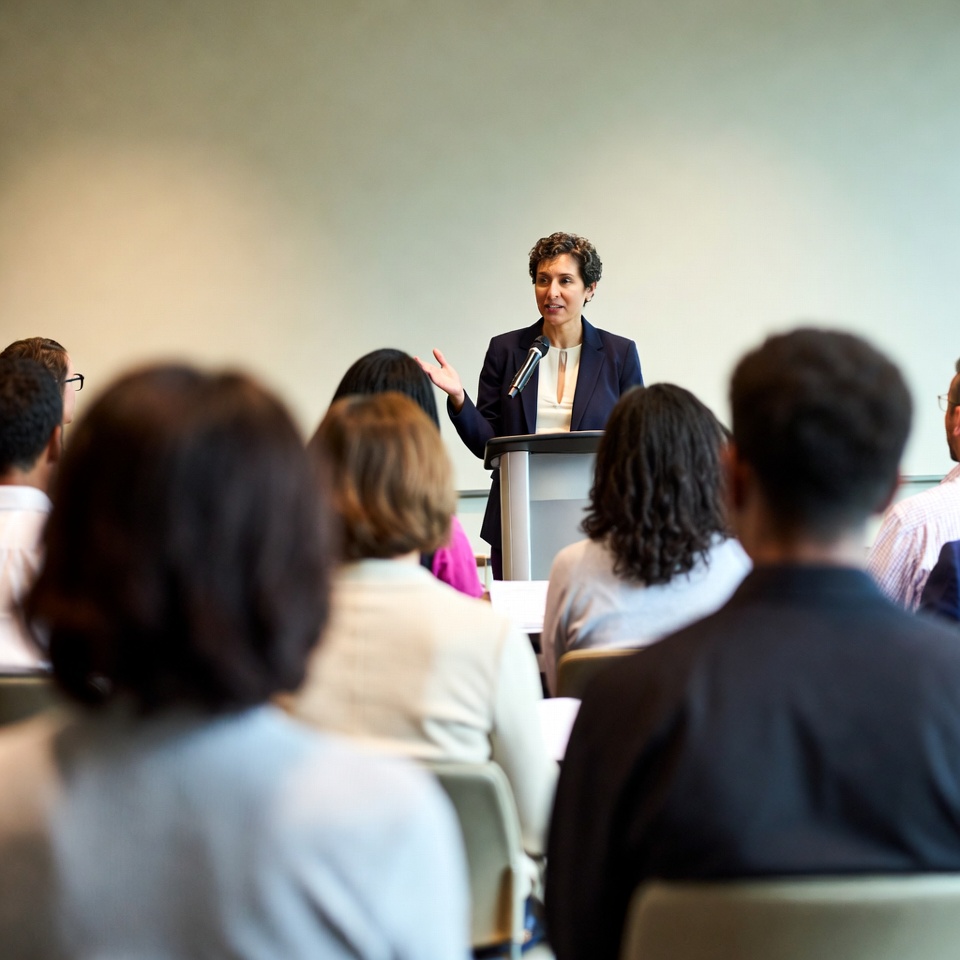 A woman with curly dark hair stands at a podium in a classroom, gesturing with her hand while wearing a dark suit. She addresses a diverse audience of men and women seated at desks facing her. The room features light green walls and several chairs with attentive listeners.