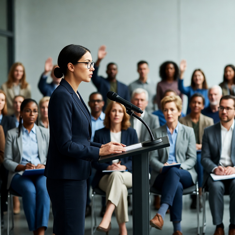 African-American, Asian, Middle Eastern, White, audience, business meeting, business suit, conference, corporate event, diverse crowd, gesturing, glasses, men, microphone, modern room, notes, podium, presentation, professional attire, public speaking, raised hand, raised hands, seated audience, speaking, suits, women, woman