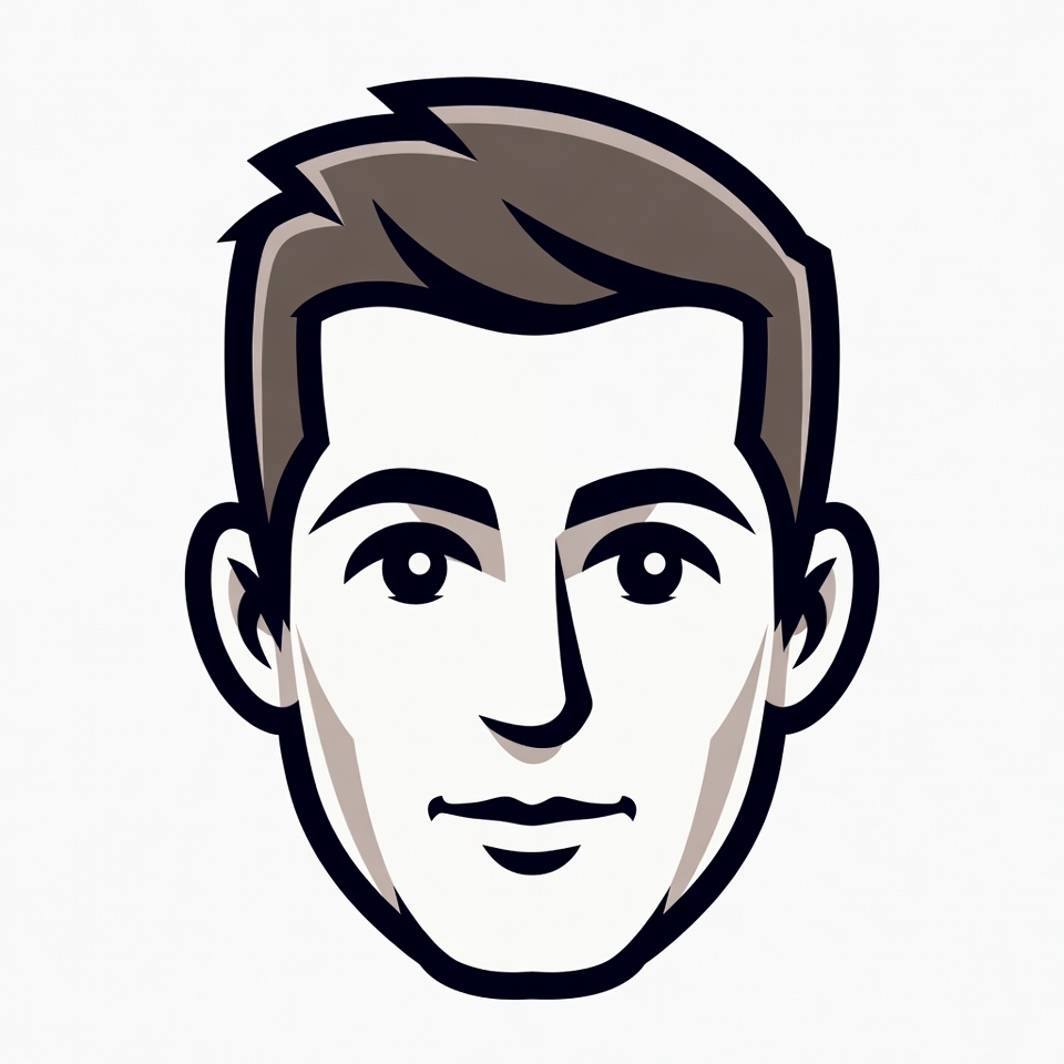 A stylized cartoon illustration of a young man's face with short brown hair, dark expressive eyes, and a subtle smile. The design features bold black outlines and minimal shading on a white isolated background.