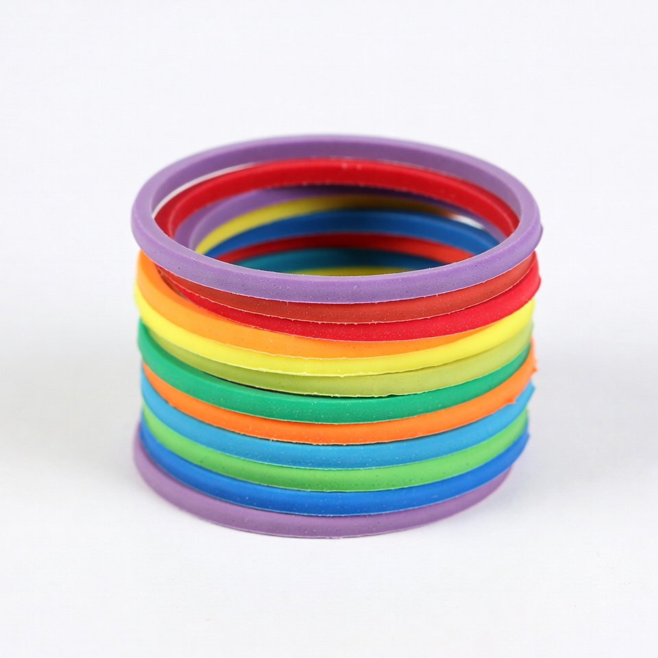 A stack of colorful rubber wristbands in rainbow hues sits isolated on a white background. The bands include red, orange, yellow, green, blue, indigo, and purple, neatly piled together. Each band is smooth and cylindrical.
