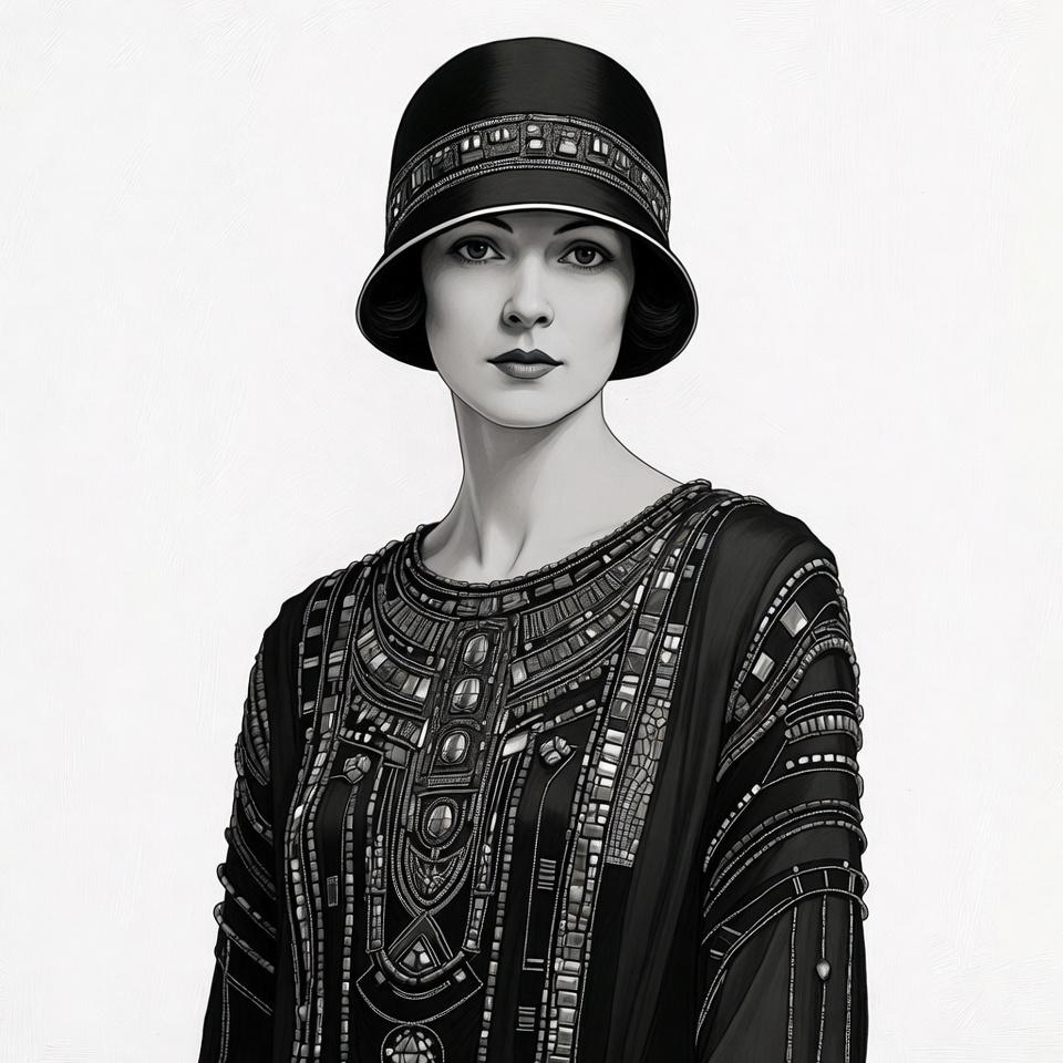 A woman with a bob haircut wears a black cloche hat with decorative banding. She is dressed in an ornate black beaded flapper dress featuring intricate geometric patterns. The illustration is rendered in black and white on an isolated white background.