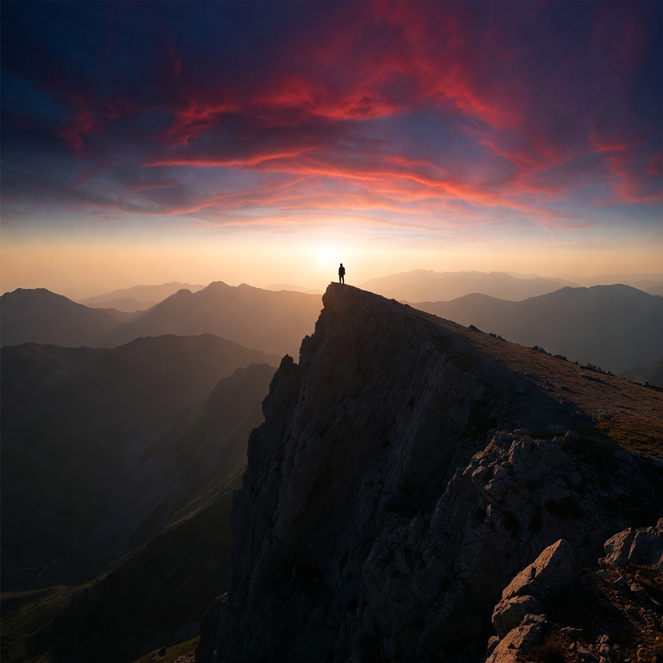 A lone male silhouette stands on a rocky mountain cliff overlooking layered mountain ranges. Vibrant sunset sky features red and purple clouds with golden hues illuminating the horizon. The scene captures dramatic peaks and valleys in soft twilight light.