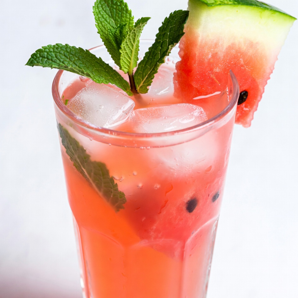 beverage, cocktail, cocktail glass, drink, fresh mint, fruit, fruit cocktail, garnished drink, glass, glass, ice, ice cubes, iced beverage, mint, mint garnish, mint leaves, pink beverage, pink drink, refreshing, refreshing drink, summer, summer drink, tall glass, watermelon, watermelon slice, watermelon wedge, watermelon cocktail