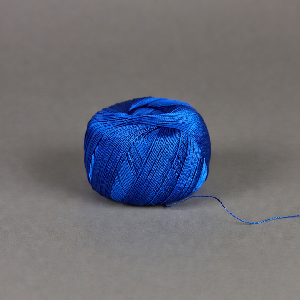 A vibrant blue ball of yarn sits on a gray background. The yarn is neatly wound with a thin strand trailing from it. The smooth texture of the yarn is clearly visible.