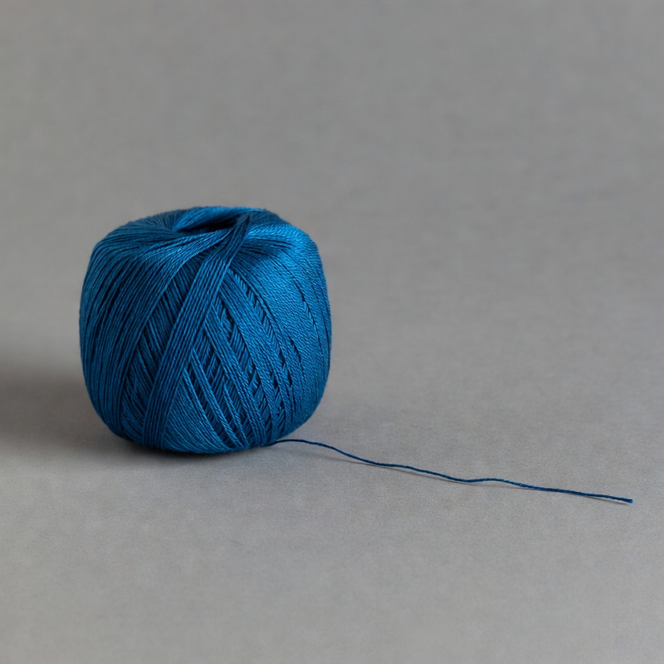 A round ball of vibrant blue yarn sits on a smooth gray surface. A single strand of yarn trails from the ball across the background. The yarn has a textured, tightly wound appearance.