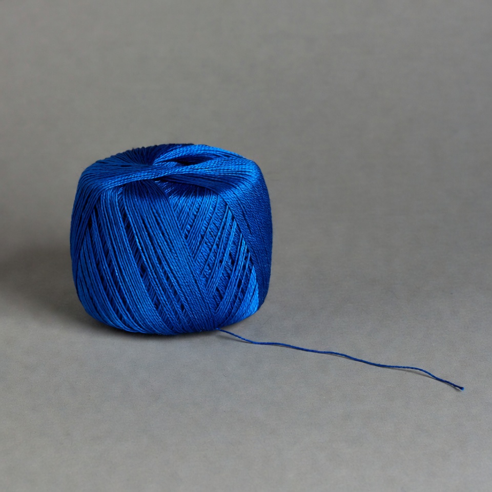 A vibrant blue ball of yarn sits on a smooth gray surface. Fine strands of yarn are neatly wound into a round shape with a loose thread trailing from it. The yarn has a shiny, silky texture.