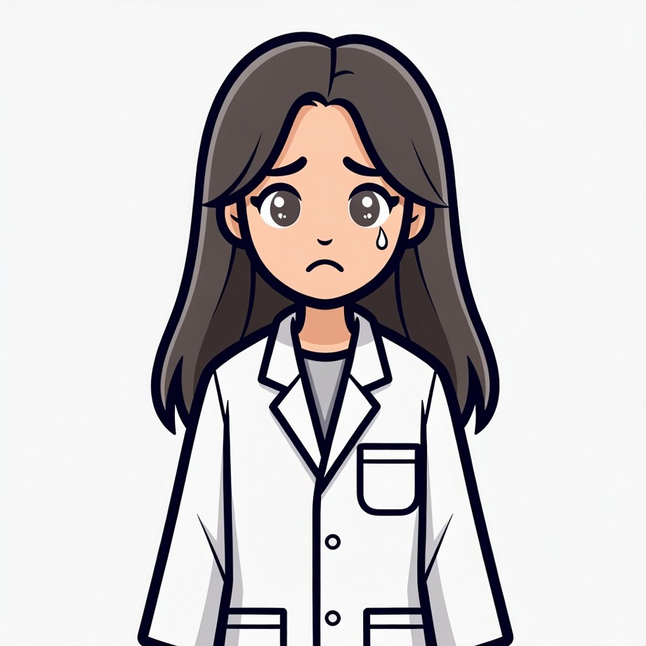 Asian, big eyes, brown hair, cartoon, clipart, crying girl, doctor, female, illustration, isolated background, lab coat, long hair, sad girl, scientist, tears, white coat, anime girl
