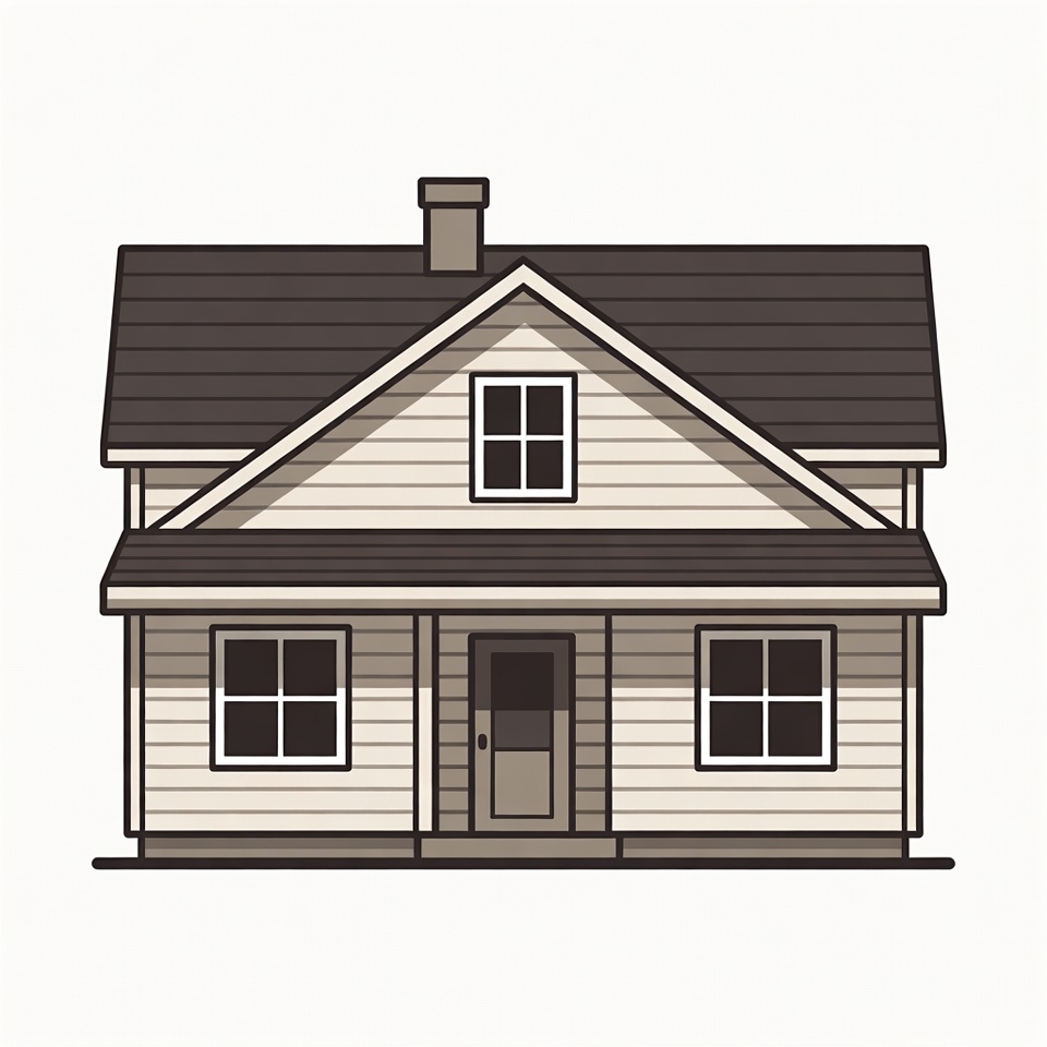 A simple line art illustration of a two-story house features light brown siding, dark brown roof, and a front porch with a gabled overhang. White-framed windows adorn the upper and lower levels, with a central door on the porch. A chimney rises from the roof, all set against a plain white background.