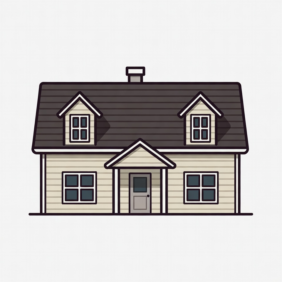 A minimalist line drawing of a two-story house with beige siding and dark gray sloped roof. It features two dormer windows, front windows, a central door under a small porch, and a chimney. The illustration is on an isolated white background.