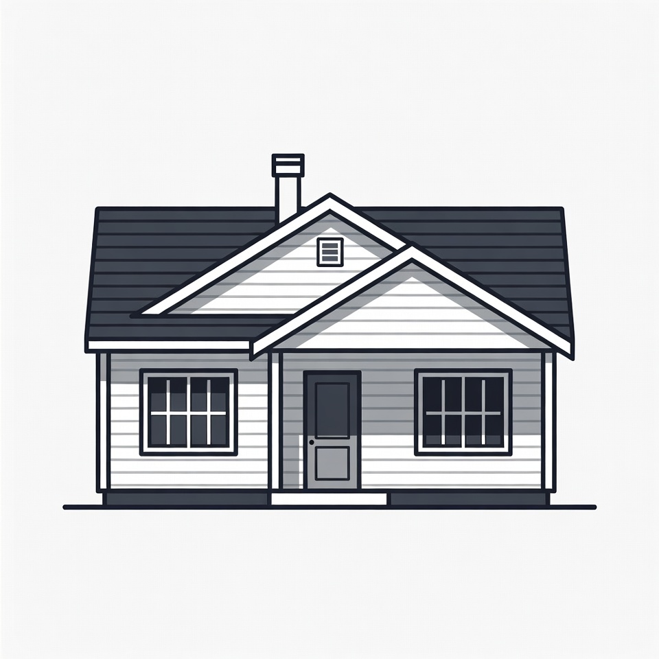 A simple line art illustration of a white house with a dark gray roof and chimney. It features two windows, a front door, and a gable roof on an isolated white background. The style is minimalist vector clipart.