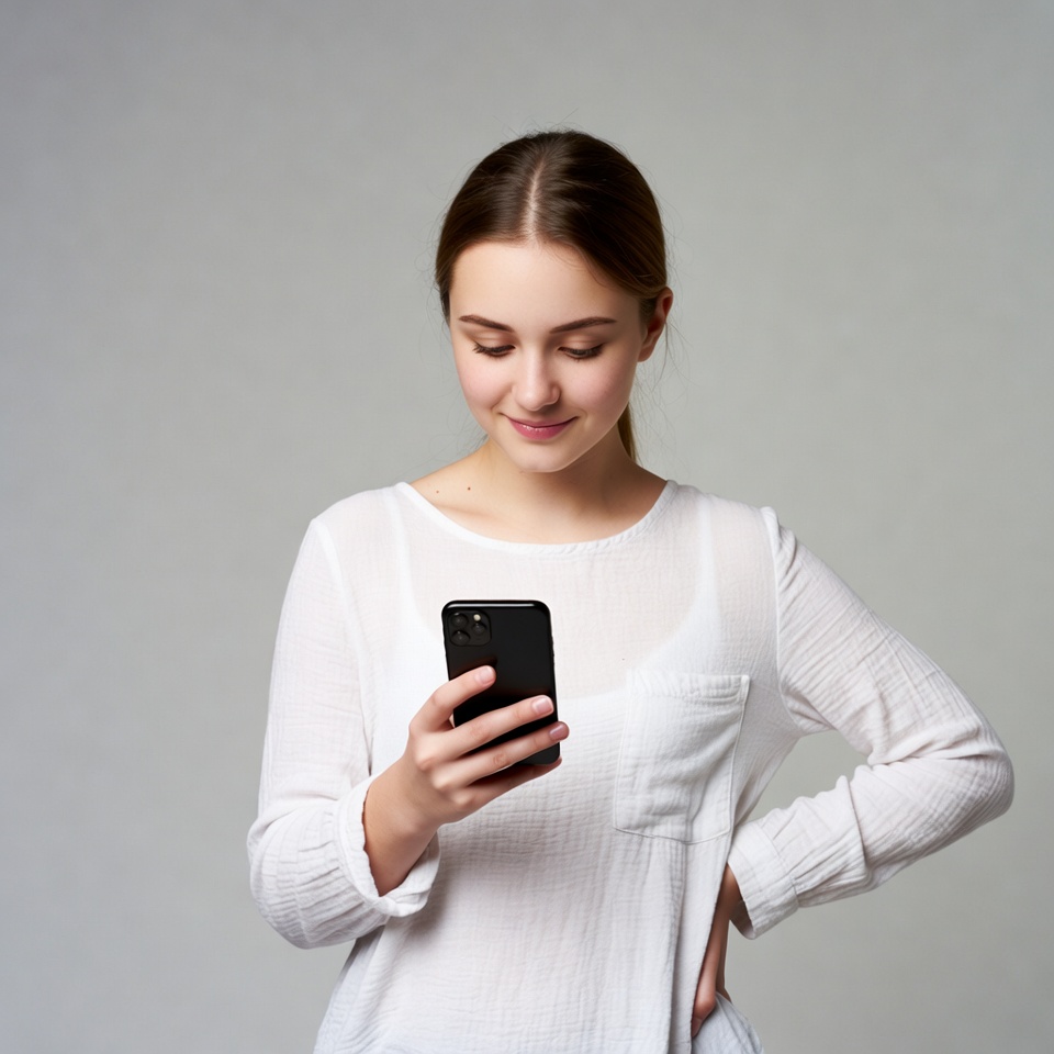 A young woman with light brown hair in a ponytail smiles while looking at her black iPhone. She wears a loose white long-sleeved top with pockets and stands against a plain gray background. Her hands hold the phone in front as she gazes down at the screen.