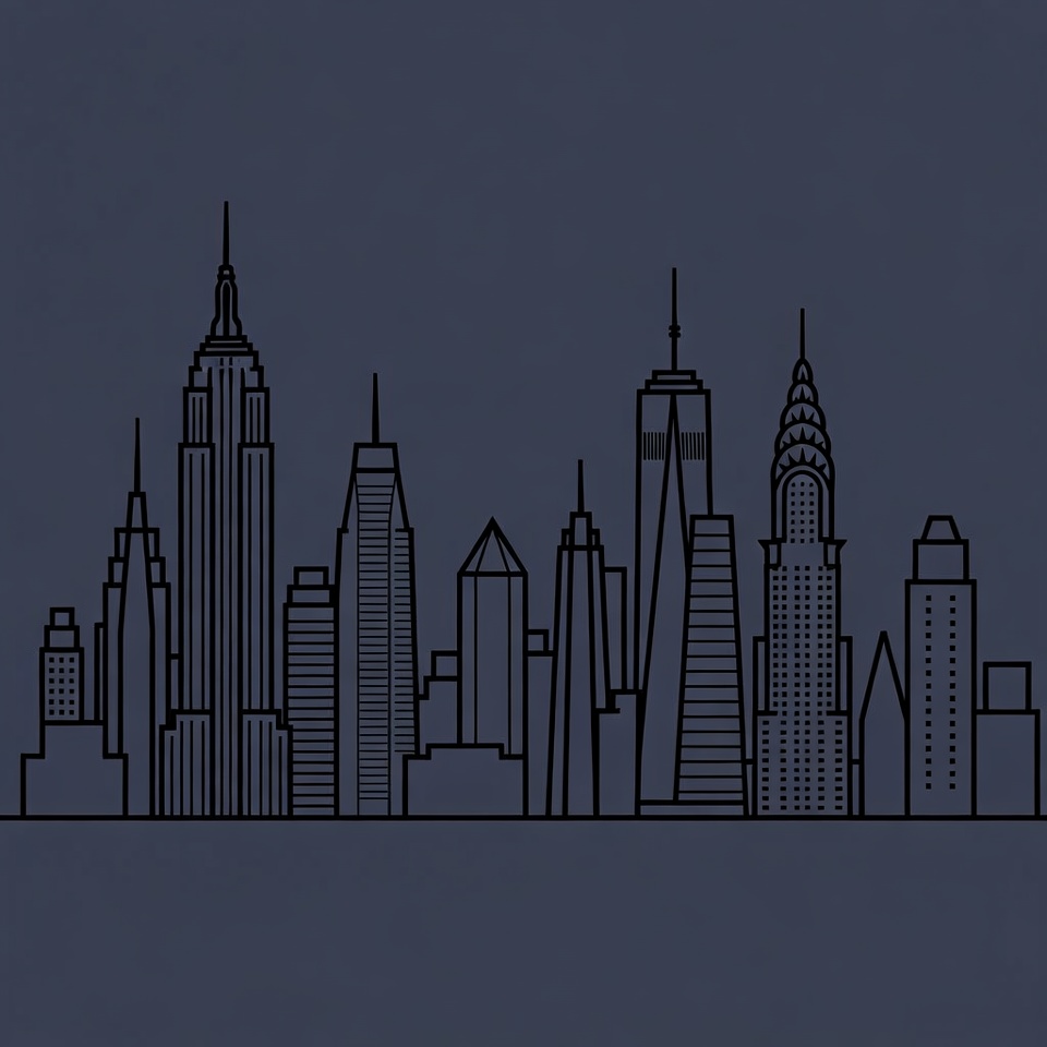 A black line art silhouette of the New York City skyline against a dark navy background. Iconic skyscrapers including the Empire State Building, Chrysler Building, and One World Trade Center are depicted in outline form. The illustration features numerous tall buildings with distinct architectural shapes.