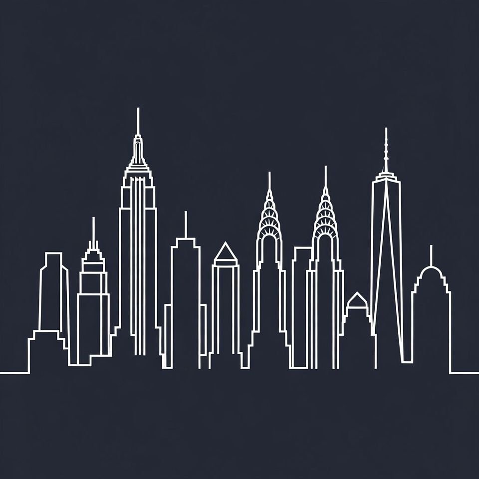 A minimalist white line drawing of the New York City skyline on a dark navy background. Prominent buildings include the Empire State Building, Chrysler Building, and One World Trade Center. The illustration features clean, simple outlines of various skyscrapers.