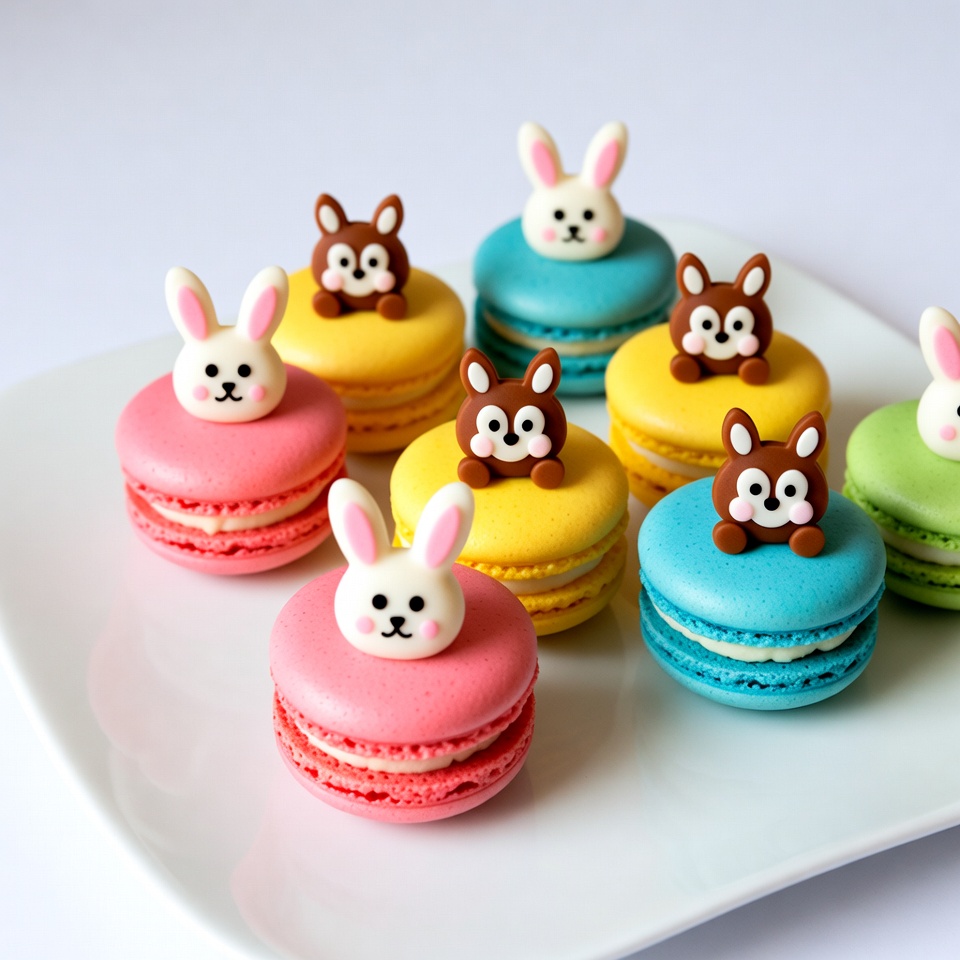 A white plate displays an assortment of colorful macarons topped with adorable bunny faces. The macarons feature pastel shades of pink, yellow, blue, and green, each with cute white, brown, and pink bunny toppers made from fondant. The bunnies have expressive eyes and ears, arranged neatly for a charming dessert presentation.