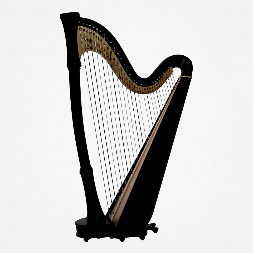 black harp, classical music, concert harp, elegant harp, gold strings, harp illustration, isolated background, musical instrument, orchestra instrument, pedal harp, string instrument, upright harp, white background, harp