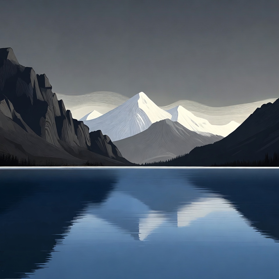 A digital illustration depicts jagged gray mountains with snowy peaks surrounding a calm blue lake. The lake perfectly mirrors the mountains and their wavy contours. The scene features a minimalist style with grayscale tones and subtle waves.
