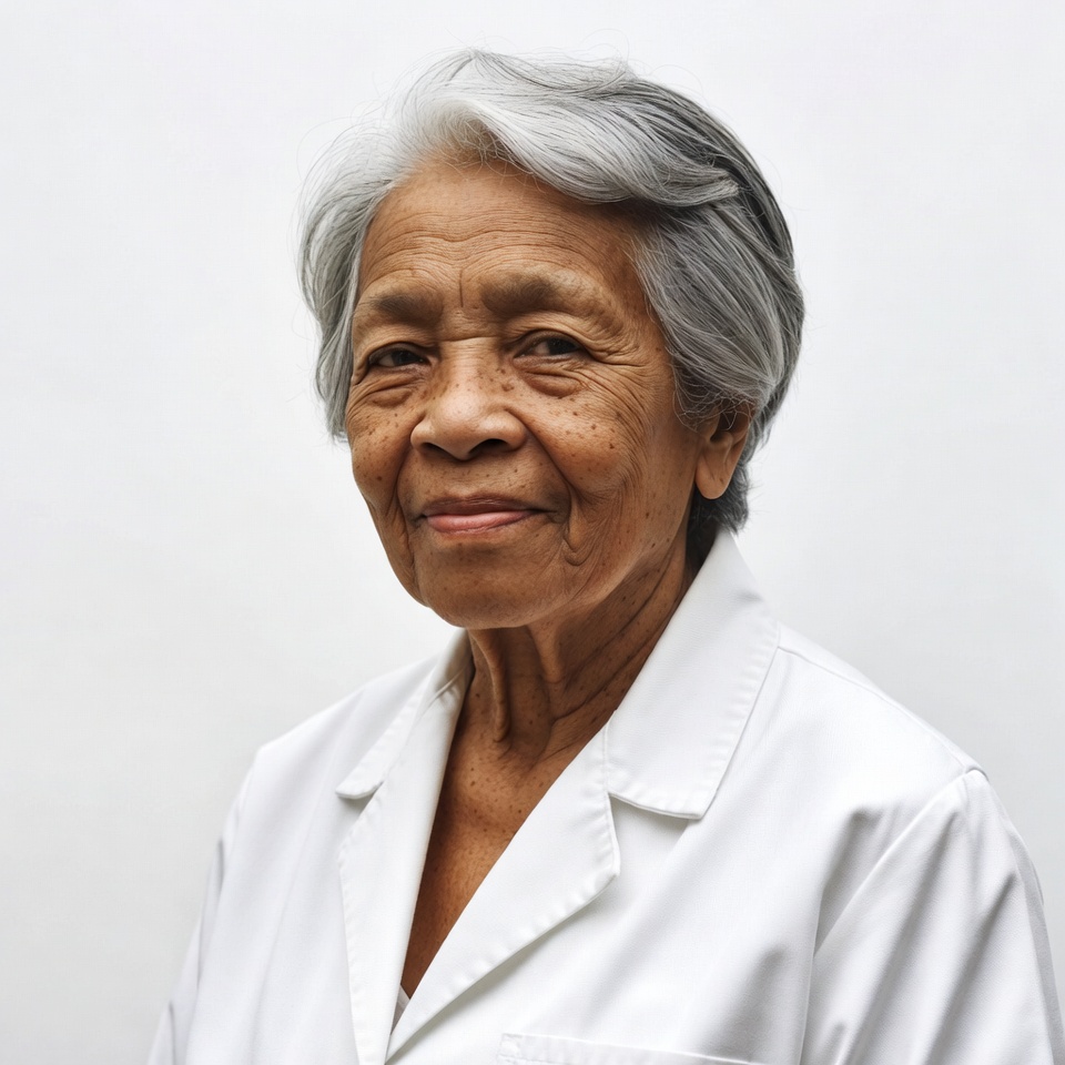 An elderly Asian woman with short gray hair smiles gently at the camera. She wears a white lab coat over a collared shirt and stands against a plain white background. Her face shows wrinkles and a warm expression.