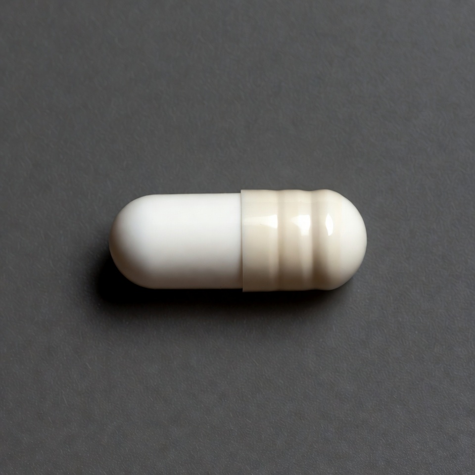 A white gelatin capsule with a beige ridged cap lies horizontally on a smooth gray surface. The pill features a smooth white body and a slightly textured cap. It is isolated against the plain background.