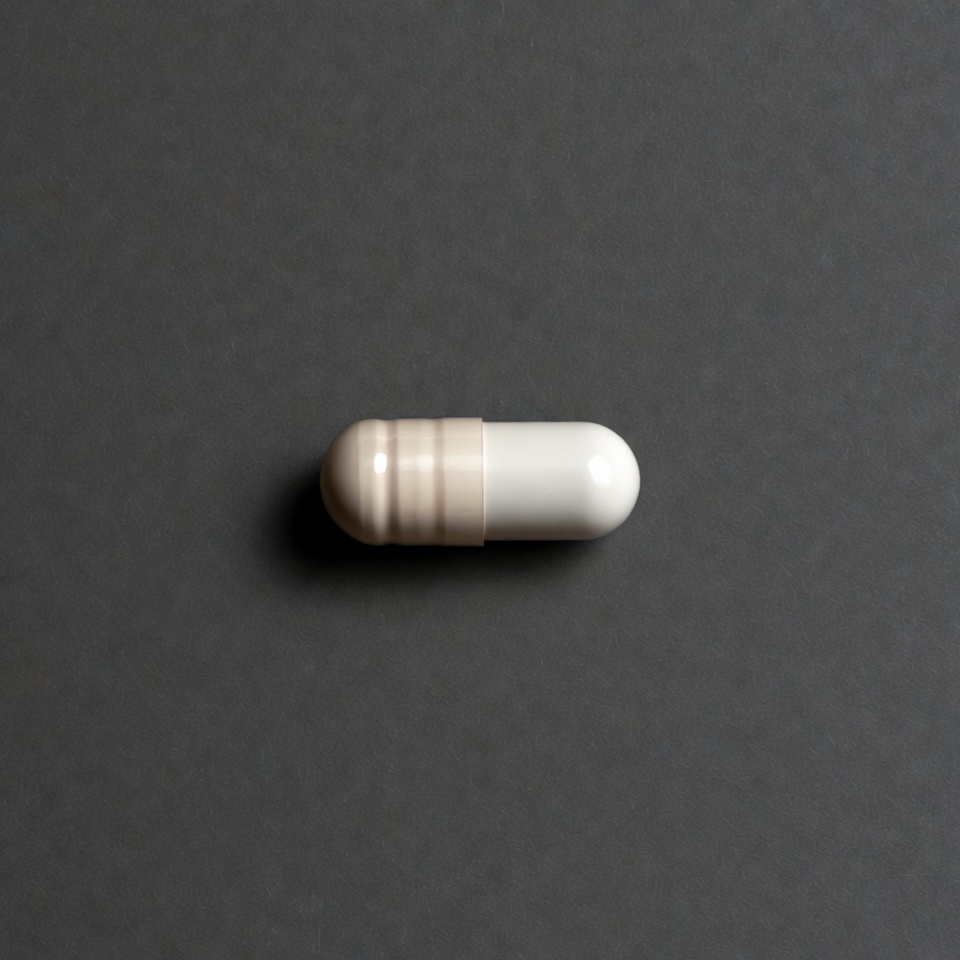 A single beige and white capsule pill lies horizontally on a smooth dark gray surface. The pill has a rounded beige top with subtle banding and a smooth white body. It is centered and isolated against the plain background.