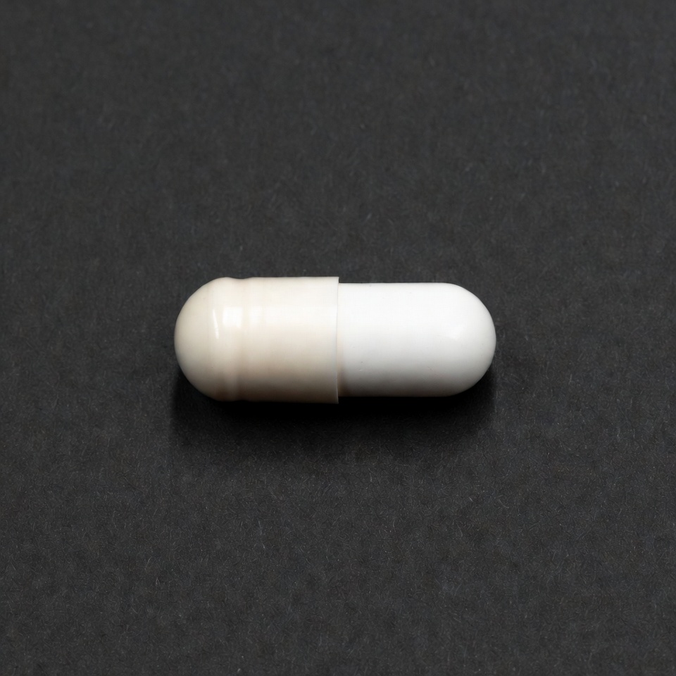 A single white capsule pill with a beige cap lies horizontally on a solid black background. The pill is smooth and glossy, centered in the frame. It is isolated with no other objects visible.