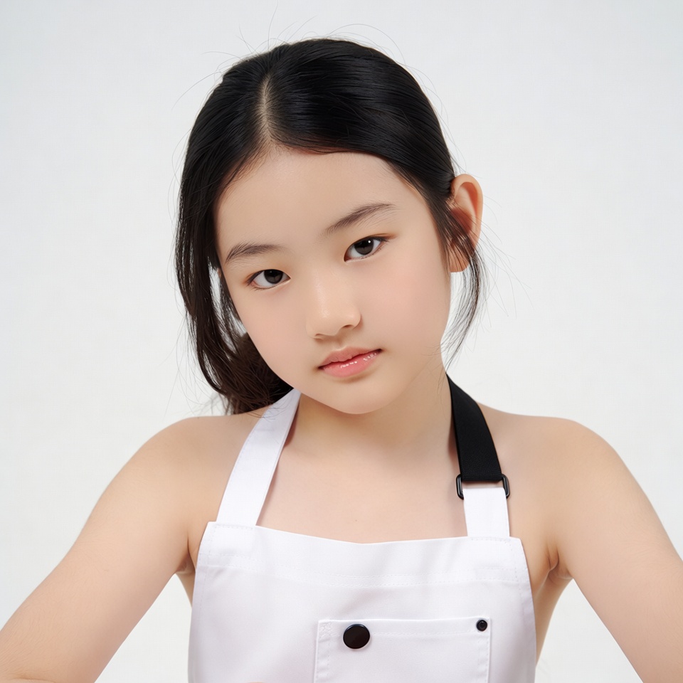 A young Asian girl with long black hair stands frontally against a white background. She wears a white sleeveless apron with black straps and a button on the pocket. Her arms are extended outward in a welcoming pose.