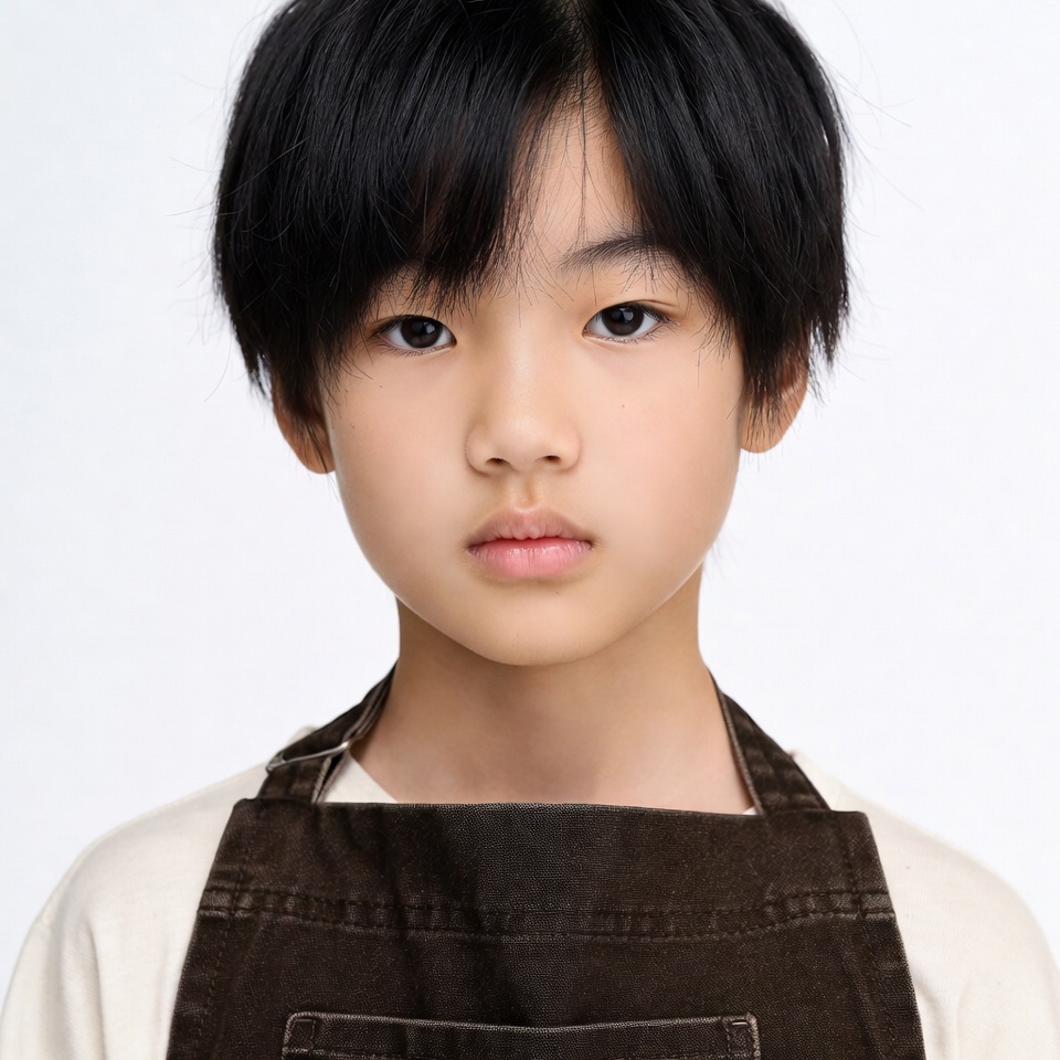 A young Asian boy with straight black hair and expressive eyes faces the camera directly. He wears a white shirt under a brown apron with straps over his shoulders. The image is a close-up portrait against a plain white background.