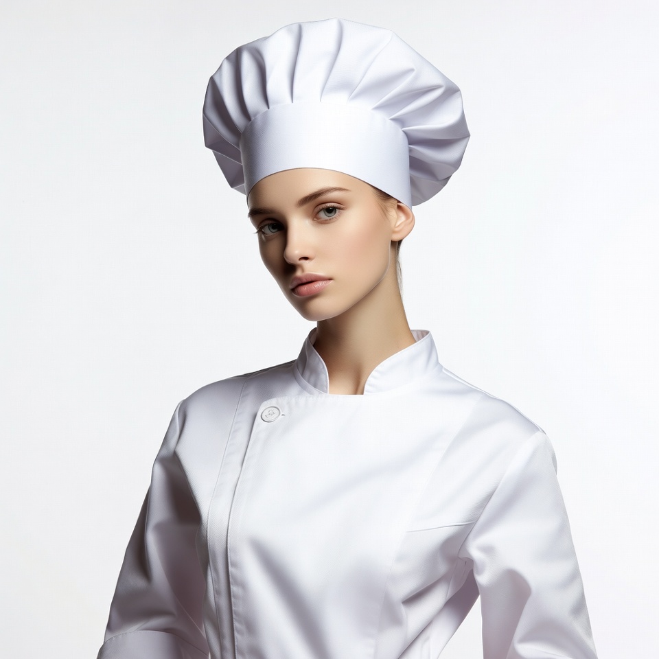 A young woman with long straight hair and fair skin stands against a plain white background. She wears a tall white chef's toque and a matching white chef's jacket with a mandarin collar and button. She gazes directly at the camera with a subtle expression.