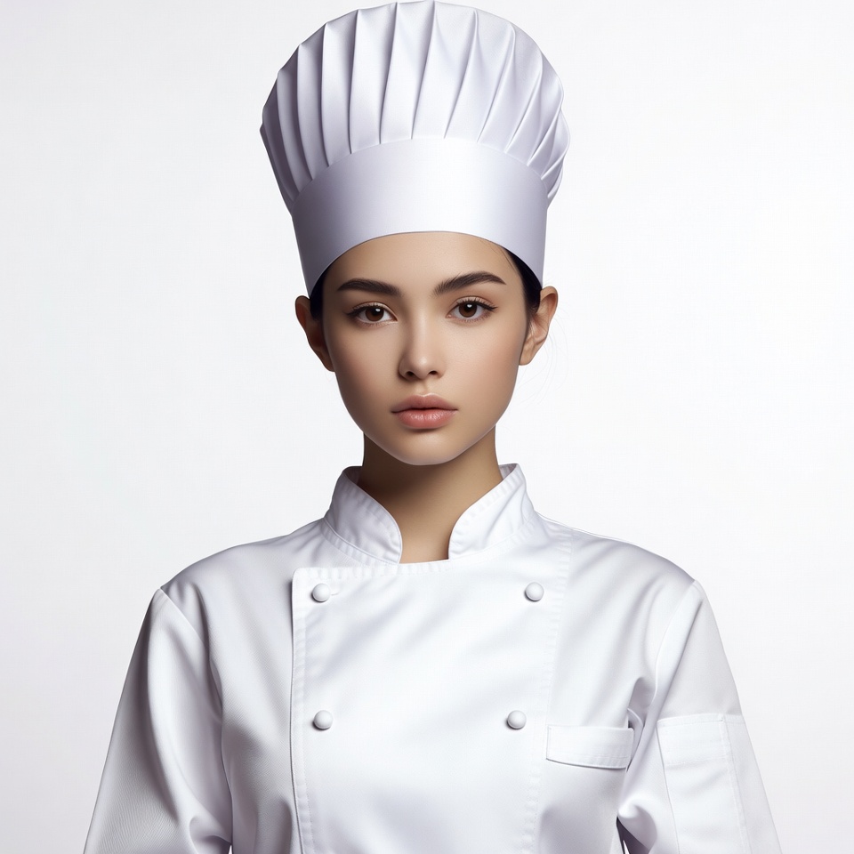 A young Asian woman with straight black hair stands confidently wearing a tall white chef's toque and matching double-breasted chef jacket. Her expression is neutral with subtle makeup, and she faces the camera directly. The image features a plain white background, isolating the subject.