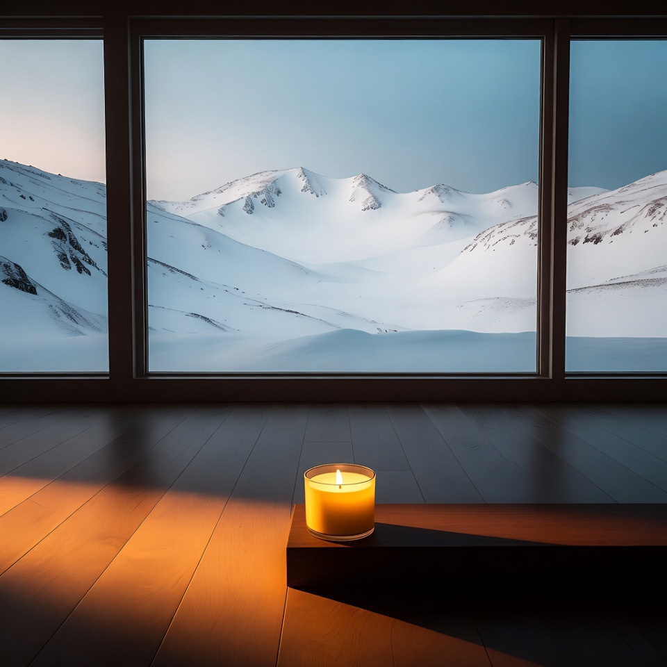 A lit yellow candle sits on a black stand on a wooden floor in a modern room. Large windows reveal snow-covered mountains under a twilight sky. Warm candlelight casts shadows on the floor.