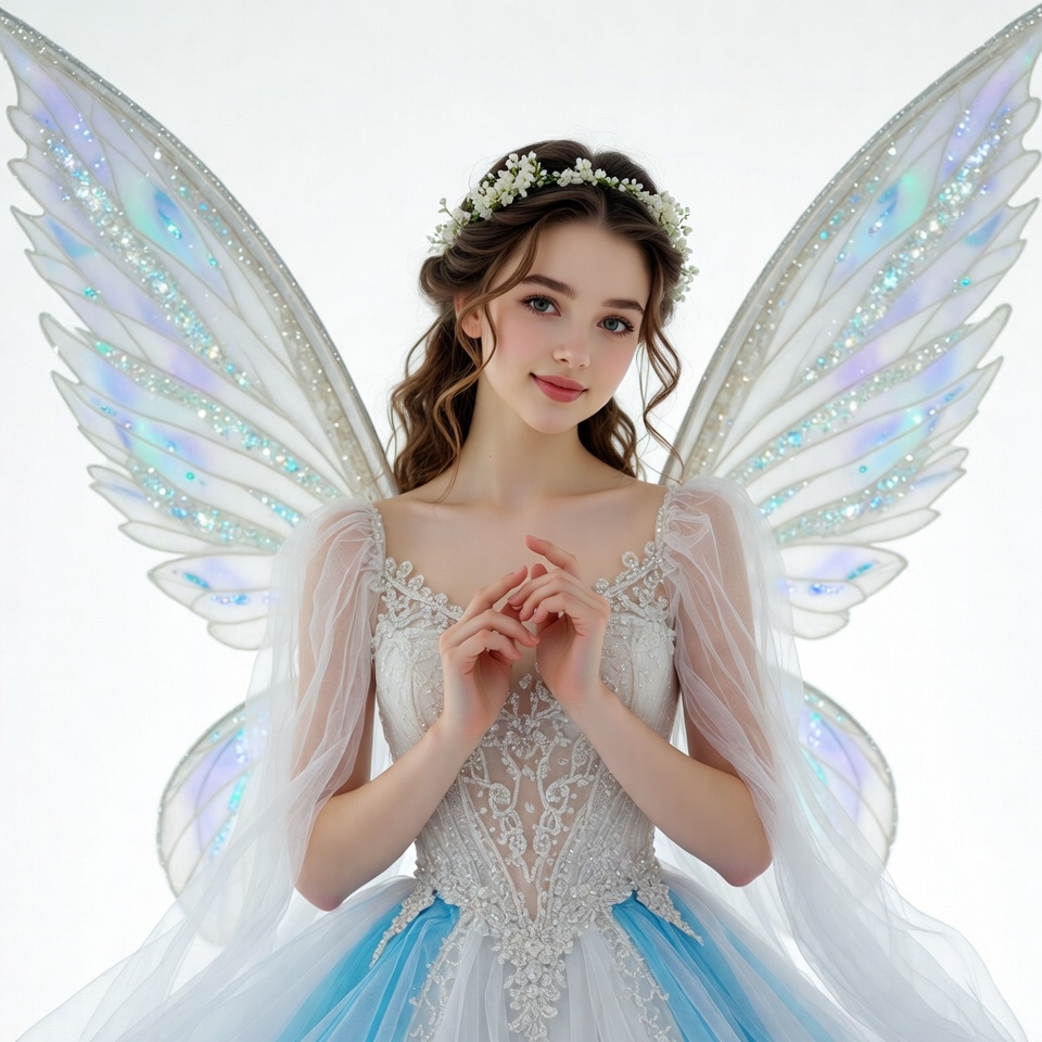 A young woman with long wavy hair adorned with white flowers wears a sparkling white and blue lace gown. She has large iridescent fairy wings extending from her back and stands with hands clasped in front. The image is set against a plain white background.