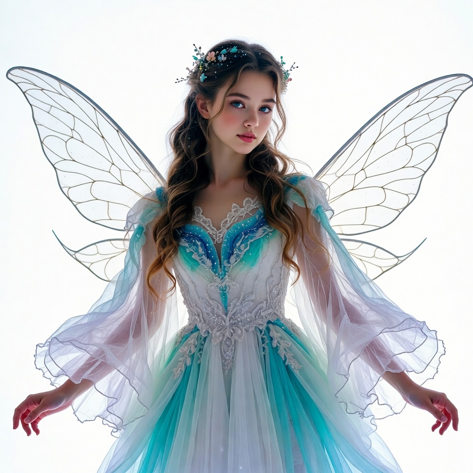 A young girl with long wavy hair adorned with flowers stands wearing an elaborate white and teal gown with lace details. She has large translucent fairy wings extending from her back and poses with hands extended on a white background. Her expression is serene and mystical.