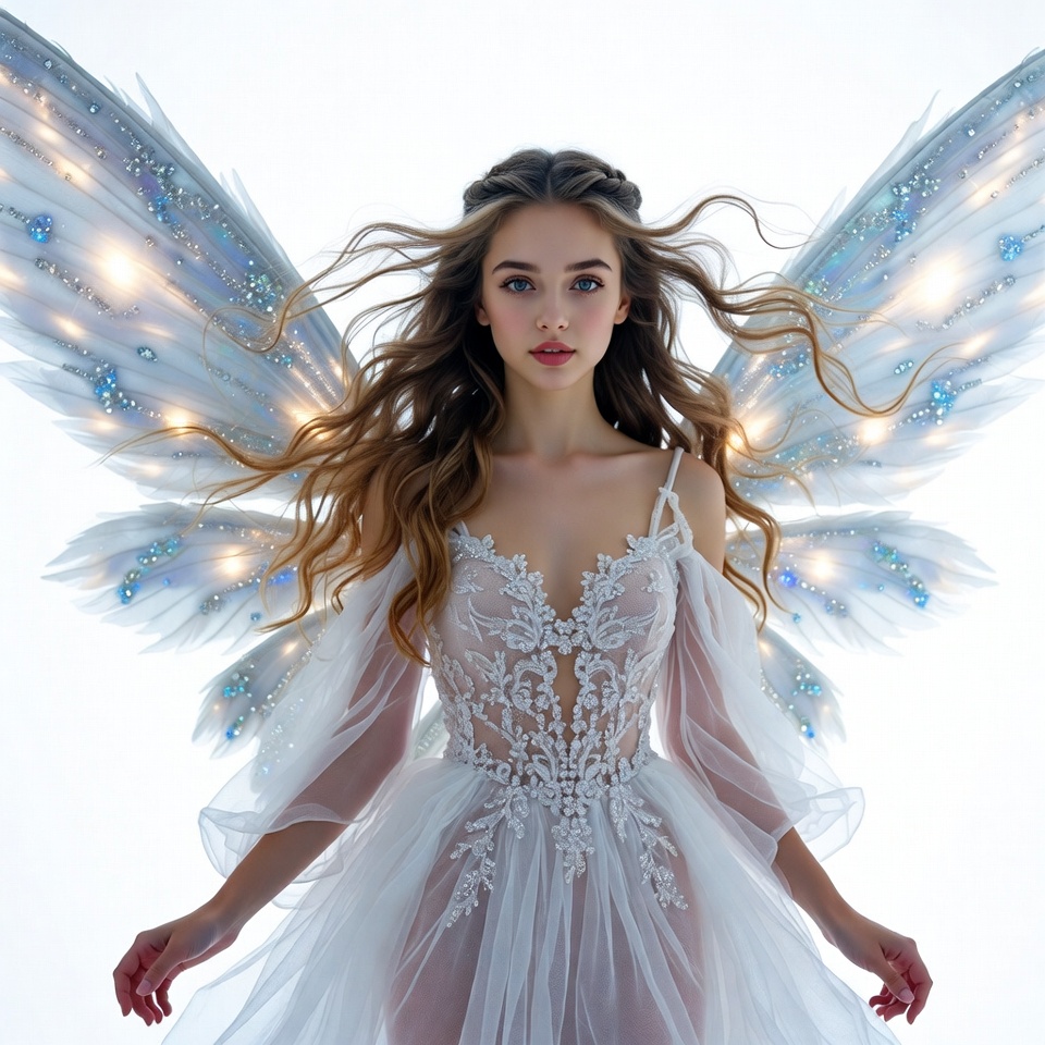 A young woman with long wavy brown hair stands wearing a sheer white lace dress with intricate embroidery. She has large translucent fairy wings glowing with blue and white lights extending from her back. Her hair is partially styled in a braided updo, and she poses with arms slightly outstretched against a white background.