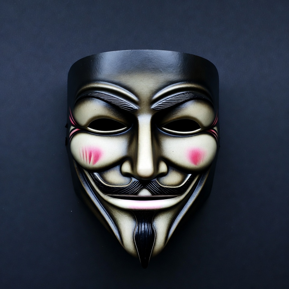 A detailed Guy Fawkes mask with a stylized face, pink cheeks, and mustache is centered against a solid black background. The mask features a black hood, white facial features, and subtle gold tones. It is displayed frontally in a close-up view.