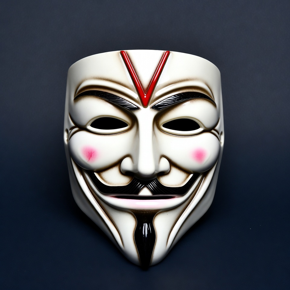 Anonymous mask, Halloween mask, V for Vendetta, black eyebrows, costume accessory, dark background, goatee, isolated background, mustache, pink blush, plastic mask, protest mask, red V, revolutionary symbol, smiling mask, white mask, Guy Fawkes mask