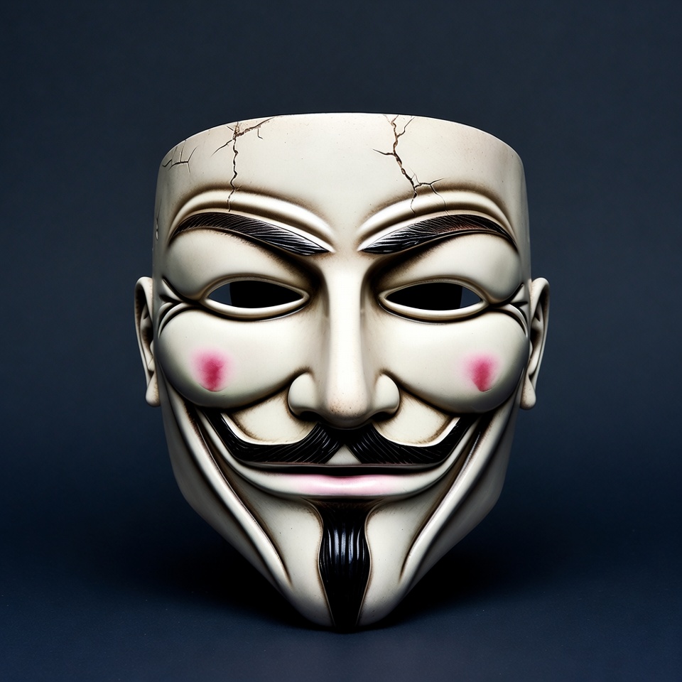 A white Guy Fawkes mask with black eyebrows, pink cheeks, and mustache is centered against a dark background. The mask features cracked porcelain-like texture and hollow eye sockets. It is displayed frontally in close-up view.