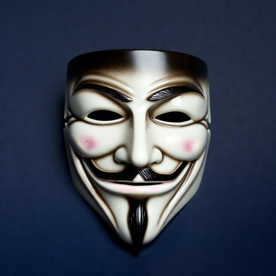 V for Vendetta, anonymous mask, arched eyebrows, costume mask, dark blue background, eye slits, goatee, hacker mask, isolated background, mask face, pink blush, plastic mask, prop mask, protest mask, revolutionary mask, smiling mask, thin mustache, white mask, Guy Fawkes mask