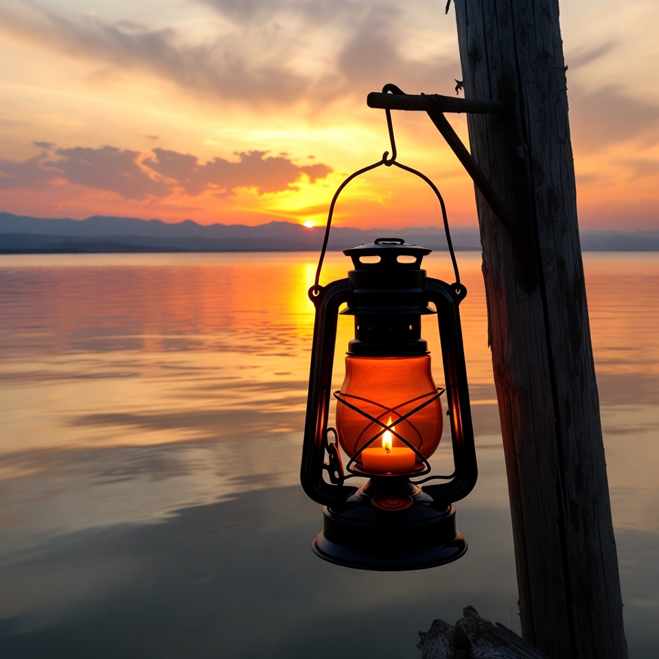 A vintage black lantern with an orange glowing candle hangs from a hook on a weathered wooden post. It overlooks a calm lake reflecting the vibrant orange and pink hues of a sunset sky. Distant mountains silhouette against the horizon.