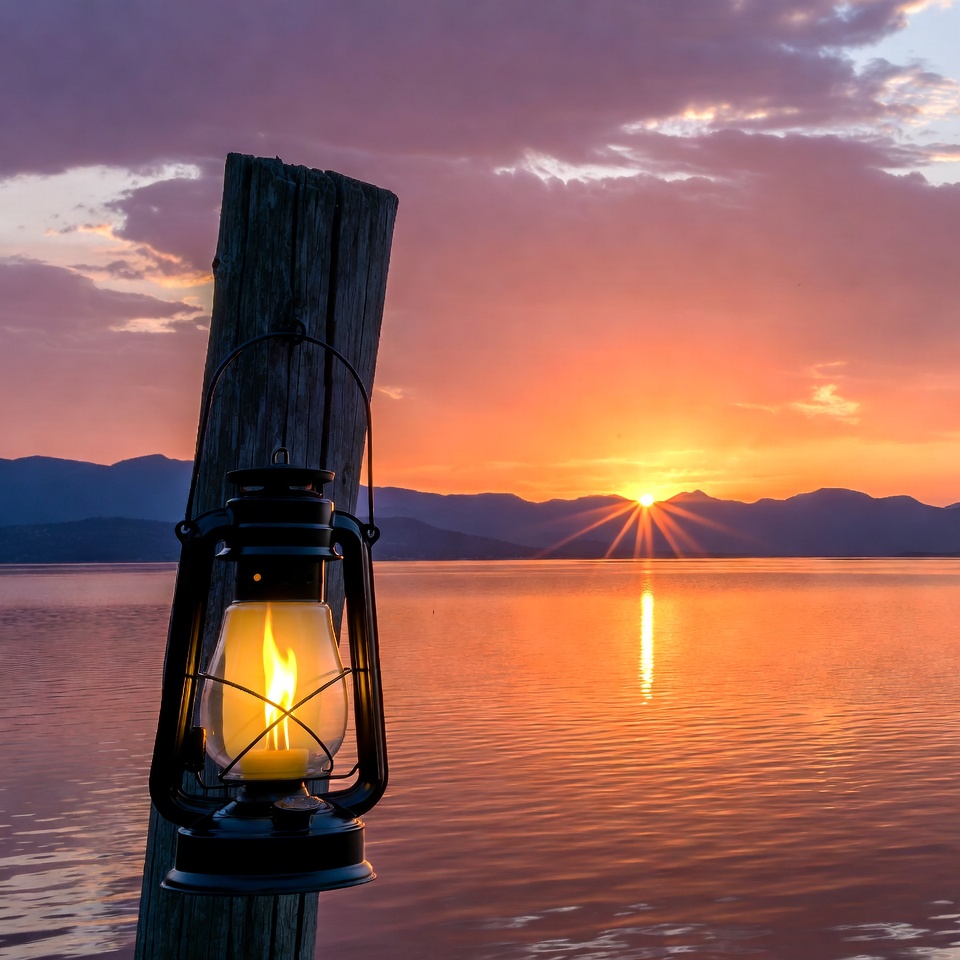 calm water, clouds, dusk, evening, fire light, glowing flame, hanging lantern, lake, landscape, mountains, nature, oil lantern, old post, orange sky, purple sky, reflection, serene lake, sky, sun rays, sunset, water, wooden post, lantern