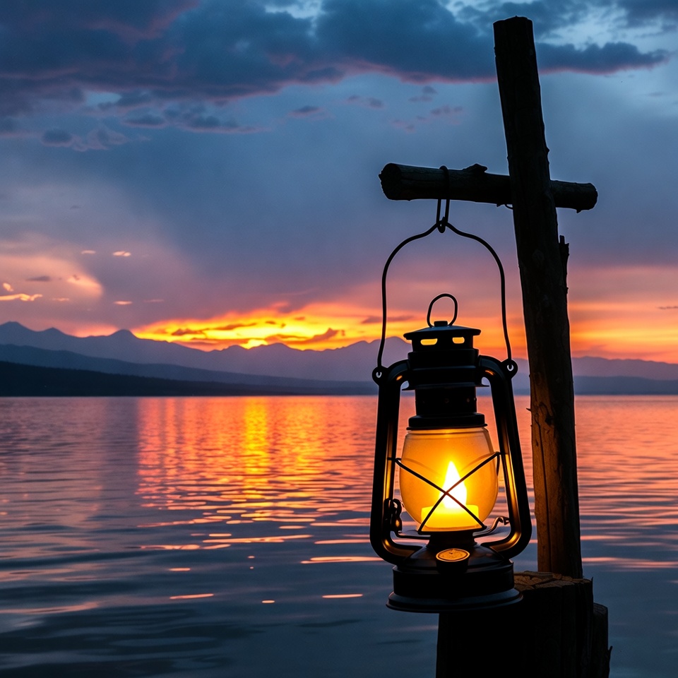 A glowing lantern hangs from a wooden post silhouetted against a vibrant sunset over a calm lake. Orange and purple skies reflect on the water with distant mountains visible. The scene captures a serene waterside moment with warm lantern light.