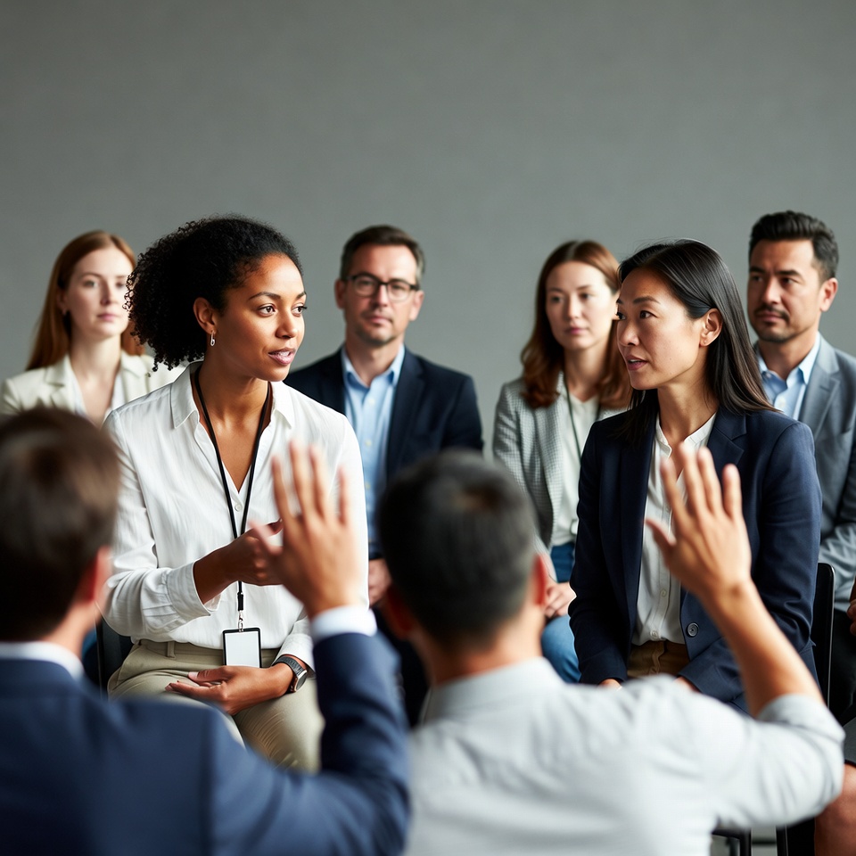 African-American, Asian, Asian woman, Black woman, Latino, Latino man, White, White woman, blazers, business attire, chairs, circle seating, conference room, diverse professionals, gray background, group discussion, hand gesture, lanyard, men, office, professionals, suits, woman speaking, women, business meeting