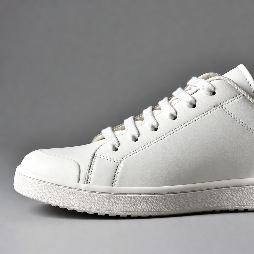 White leather sneakers on gray background