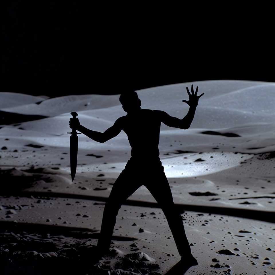 action, black silhouette, desert, dramatic, dunes, dynamic, extended arm, holding sword, isolated background, male, man, moonlit, muscular, night, pose, sand, shadow figure, sword, warrior, silhouette