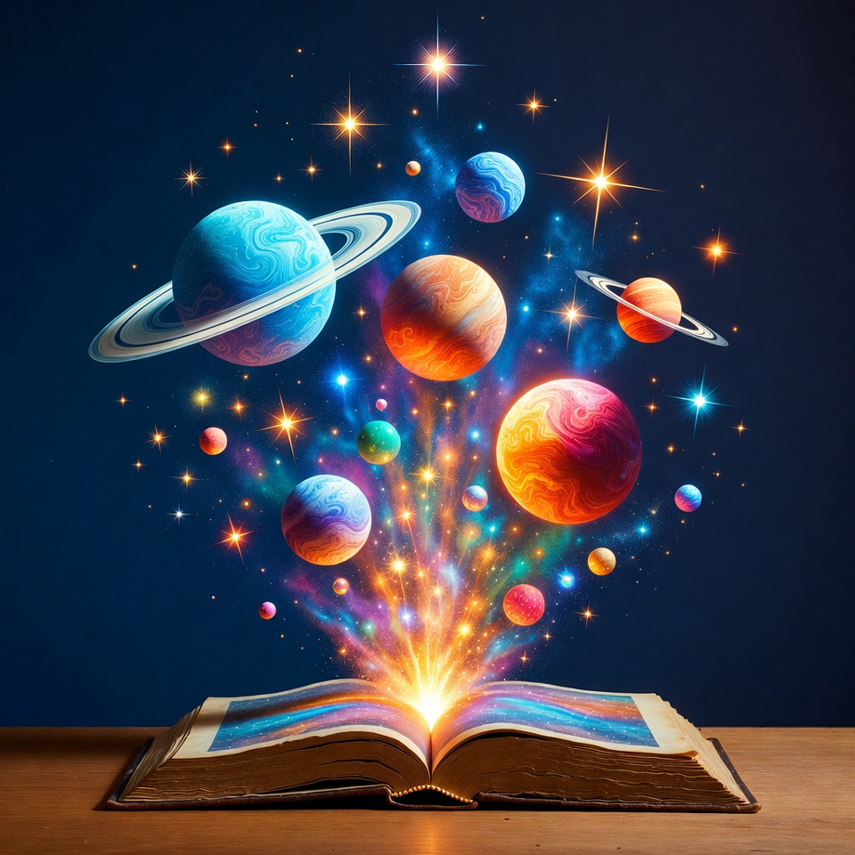 A large open book on a wooden table releases vibrant, swirling planets and stars into a dark cosmic background. The planets feature varied colors like blue, orange, pink, and green with glossy, 3D effects. Bright sparkles and bursts of light emanate from the pages, creating a magical space scene.