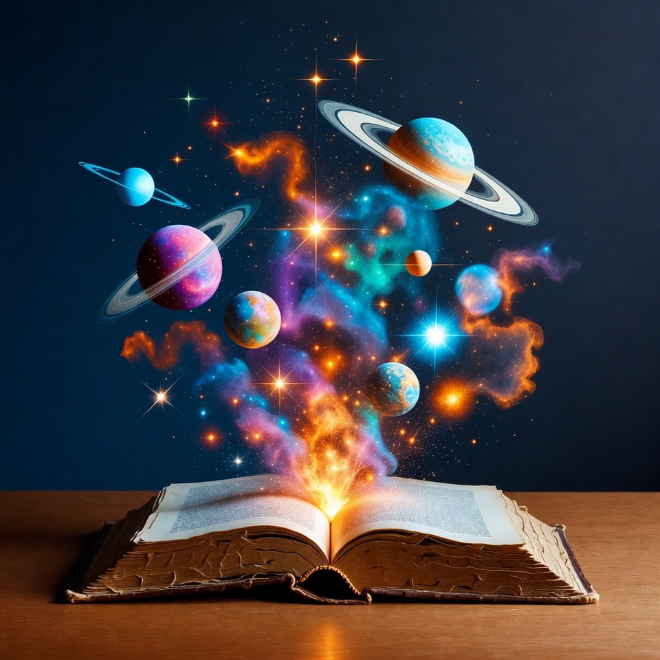 An antique open book on a wooden table emits magical bursts of colorful nebulae and stars. Vibrant planets in shades of blue, purple, orange, and teal emerge from the pages, surrounded by sparkling lights and cosmic clouds. The scene features detailed Saturn with rings and various spherical planets floating dynamically.