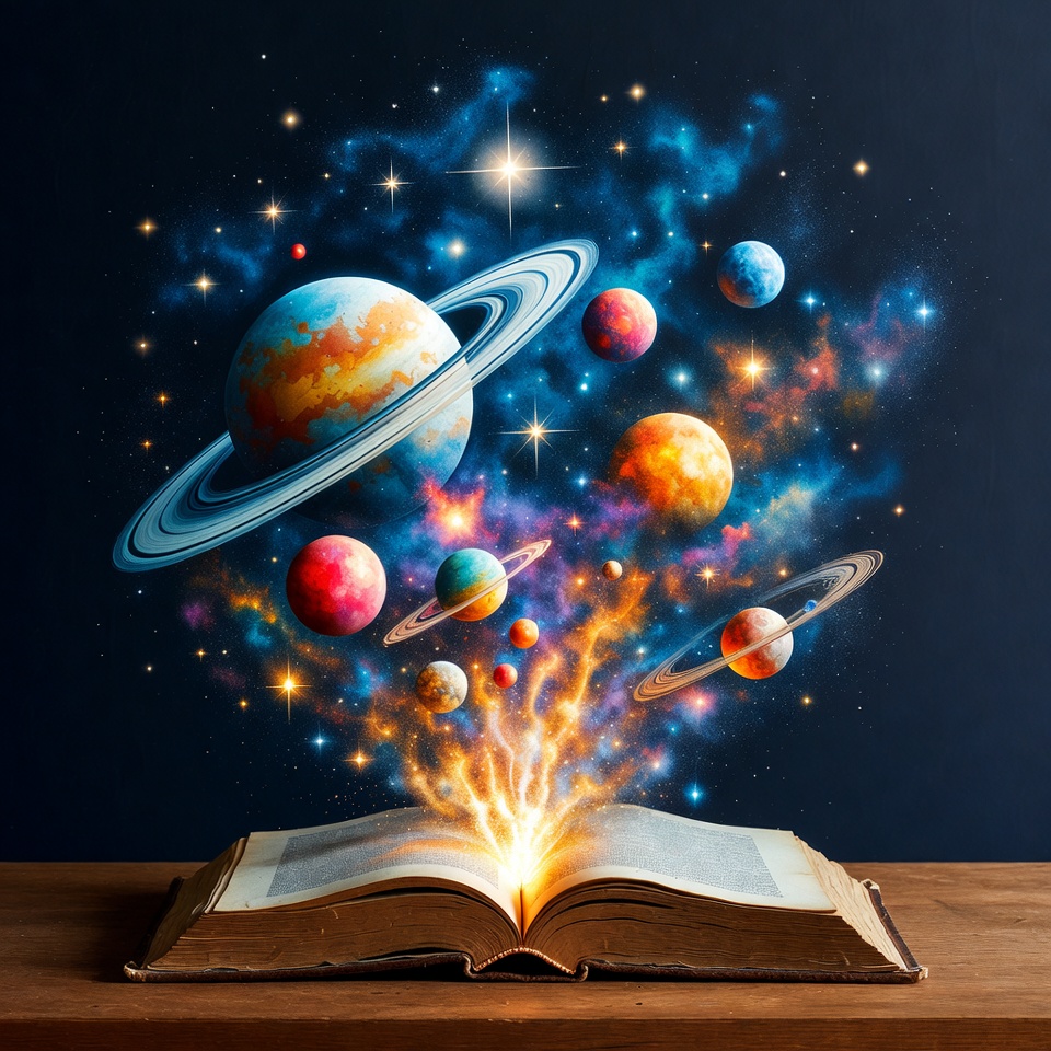 An open antique book on a wooden table emits a burst of magical energy, releasing colorful planets like Saturn with rings, Earth, Mars, and others into a starry cosmic background. The scene features vibrant blues, oranges, and purples with sparkling stars and nebulae. The book pages glow with fiery light amidst the floating celestial bodies.